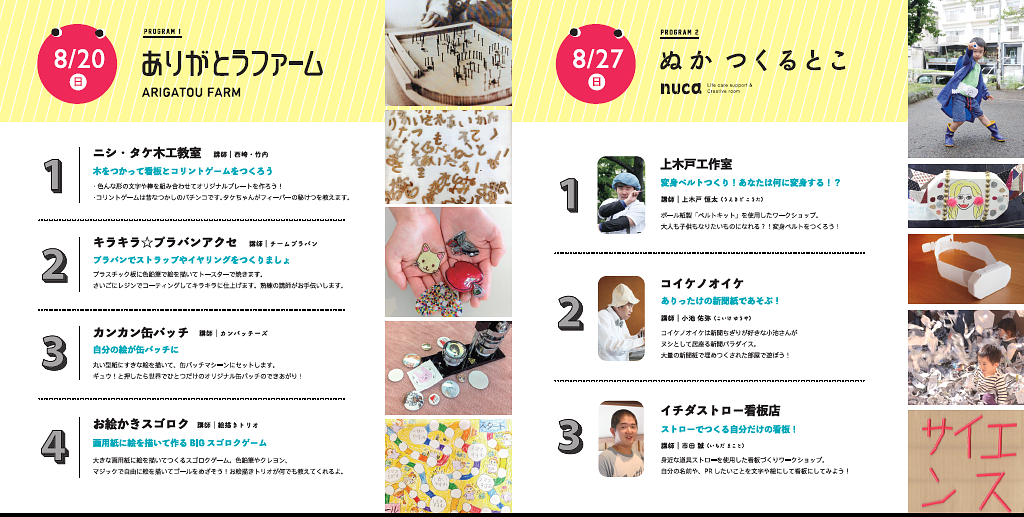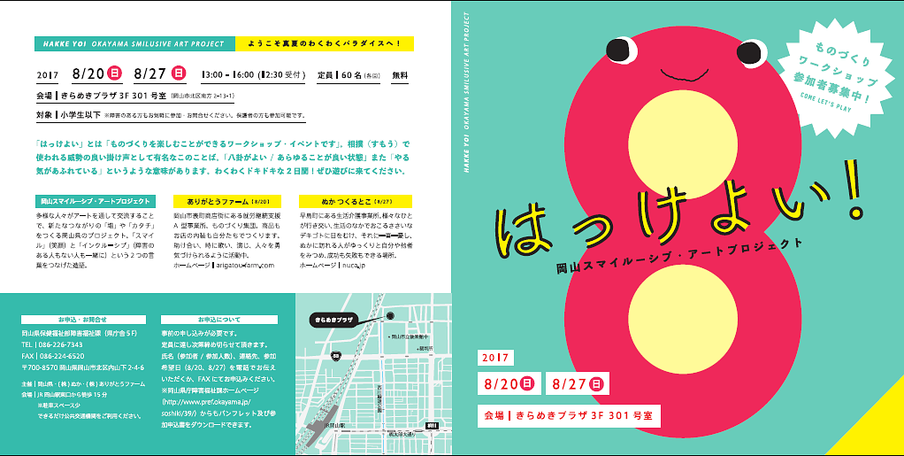第1回目の8月20日(日曜日)は「(株)ありがとうファーム」、第2回目の8月27日(日曜日)は「生活介護事業所ぬかつくるとこ」の利用者で障害のある人を講師に迎え、それぞれの個性を活かして、みんなが笑顔で交流できるワークショップ・イベントですので、多くの皆様のご参加をお待ちしています!