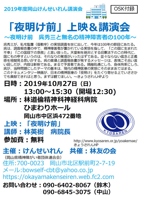 岡山けんせいれん「夜明け前 呉秀三と無名の精神障害者の100年」上映&後援会のご案内【10月27日(日)】.png 501KB