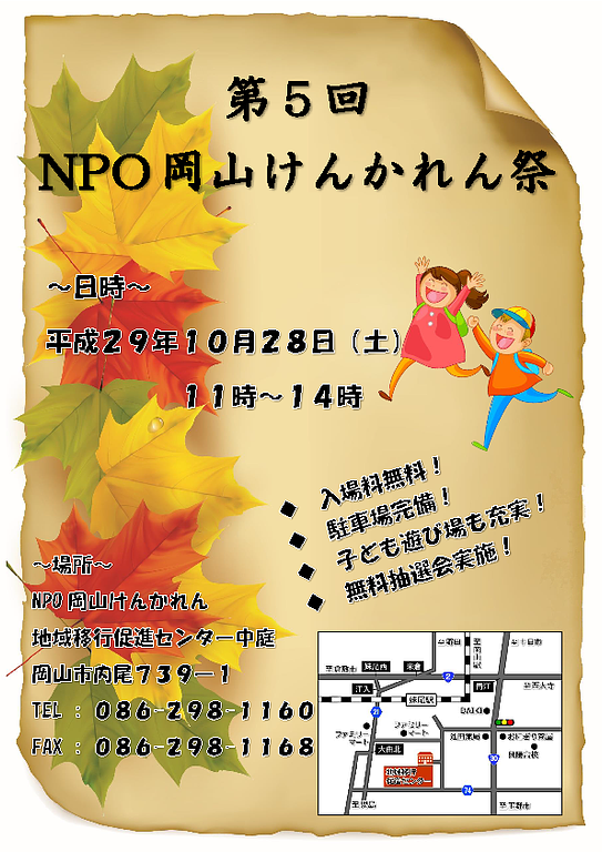 秋はお祭り・イベントが盛りだくさん。今回は、岡山市南区にある「NPO岡山けんかれん」さんのイベントをご紹介します。