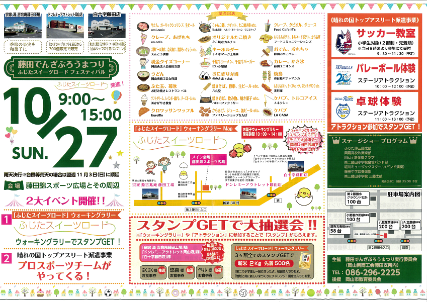 他にも会場に岡山のプロスポーツチーム「ファジアーノ岡山/岡山シーガルズ/岡山リベッツ」が来場し、体験型スポーツイベント行われるほか、ステージや20店以上の屋台の出店もあります。