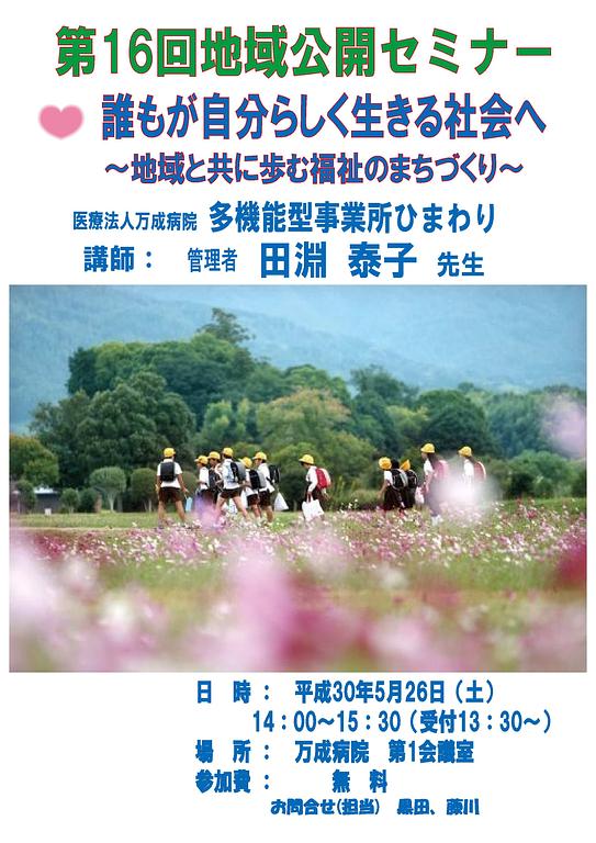 * 参加ご希望の方は、参加申込書にご記入の上FAXか郵送で、もしくはメールにて、平成30年5月19日(土)までにご返信下さい。メールでの返信の際には件名に「地域公開セミナー」とお書き下さい。尚、当日の参加も受け付けておりますので、多数のご参加をお待ちしております。