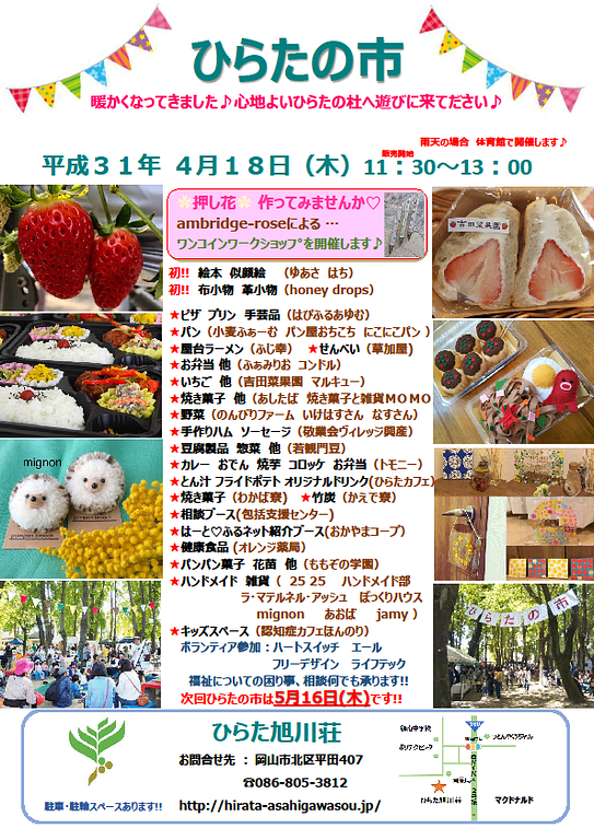 子どもからお年寄りまで いろんな人が集まる市が、ひらた旭川荘(毎月第3木曜日のお昼)で開催されています。