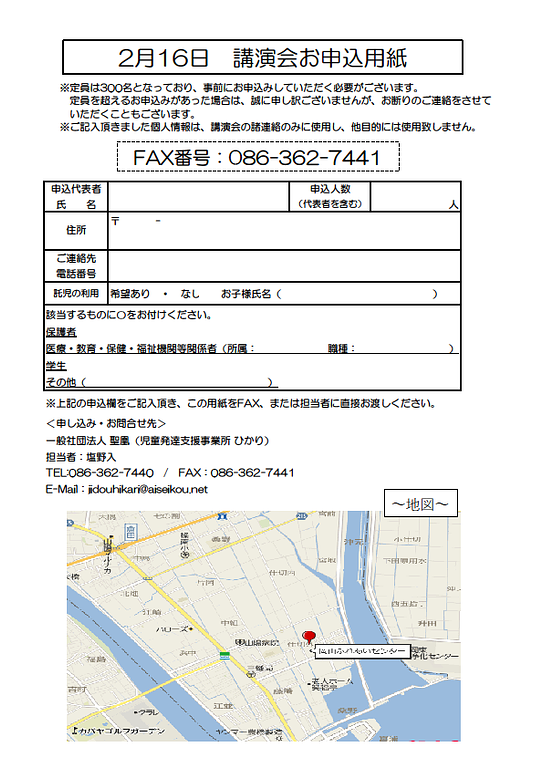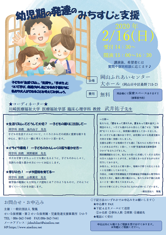 2020年1月9日地域情報「幼児期の発達のみちすじと支援」のご案内【2月16日開催】 一般社団法人 聖凰さんより講演会のご案内です。 参加費無料で関心がある方は、どなたでも参加できます。 参加申し込みは こちら です(電話やメールでも申し込みはできます)。 「幼児期の発達のみちすじと支援」のご案内【2月16日開催】.png 625KB 「幼児期の発達のみちすじと支援」のご案内【2月16日開催】.png 196KB