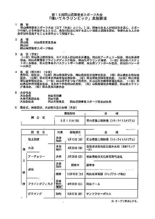 岡山県のホームページに第18回岡山県障害者スポーツ大会「輝いてキラリンピック」の案内が出ています。