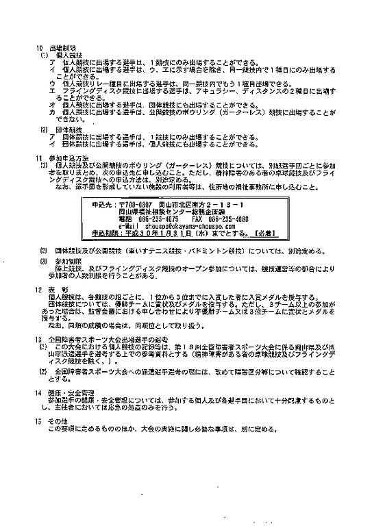 障害のある人が競技等を通じ、スポーツの楽しさを体験するとともに、県民の障害に対する正しい理解と認識を深め、障害のある人の社会参加を促進するため下記のとおり第18回岡山県障害者スポーツ大会を開催します。