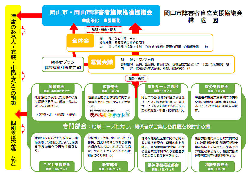 2019年6月13日自立支援協議会とは「令和元年度 第1回全体会」 を開催しました 令和元年6月11日(火)9:30~11:30に旭川荘児童院多目的ホールにて、「令和元年度 第1回全体会」を開催いたしました。内容の一部を(PDF)掲載します。 【活動報告】 「令和元年度 第1回全体会」 を開催しました .png 592バイト ■議事録 ■進行スケジュール ■構成図(新) ■参加者 ■地域部会(中央・北) ■地域部会(東部) ■地域部会(南西) ■広報部会 ■福祉サービス部会 ■教育部会 ■就労支援部会 ■精神保健福祉部会 ■こども支援部会 ■相談支援部会(新設) ■障害福祉計画WG 「令和元年度 第1回全体会」 を開催しました .png 414KB 「令和元年度 第1回全体会」 を開催しました .png 234KB
