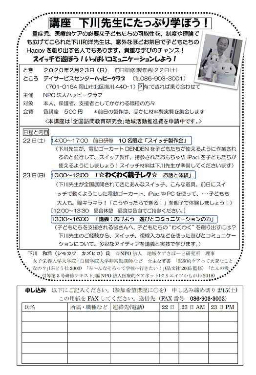 2020年2月5日地域情報重症児・医療的ケア児関連研修「下川先生にたっぷり学ぼう」のご紹介 ハッピークラブ様よりイベントのご紹介です。 【問合せ先】 デイサービスセンターハッピークラブ TEL:086-903-3001 申込書はこちらです。 重症児・医療的ケア児関連研修「下川先生にたっぷり学ぼう」のご紹介.png 1.34MB