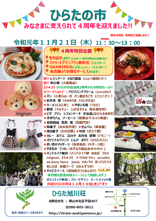 子どもからお年寄りまで いろんな人が集まる市が、ひらた旭川荘(毎月第3木曜日のお昼)で開催されています。