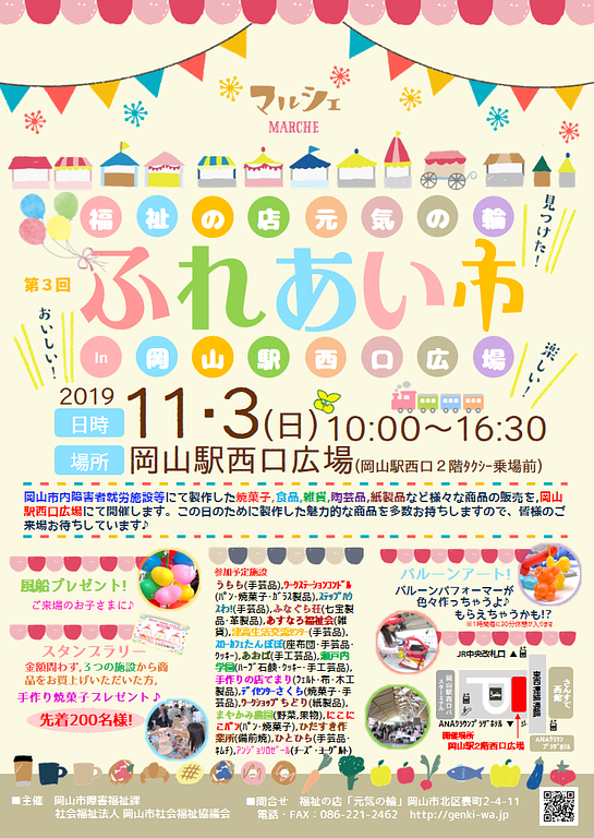 福祉の店「元気の輪」ふれあい市 in 岡山駅西口広場 令和元年11月3日(日曜日)開催チラシ