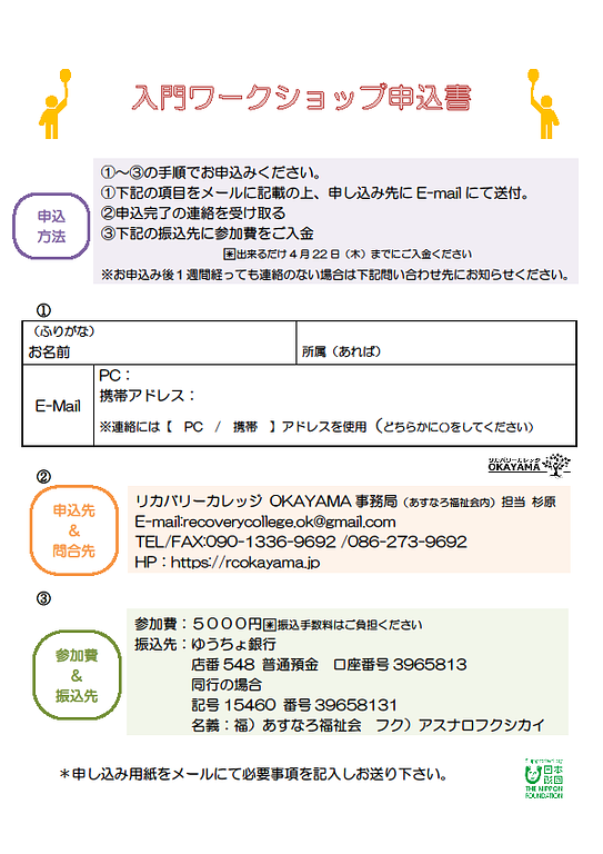 リカバリーカレッジ OKAYAMA 事務局(あすなろ福祉会内)担当 杉原