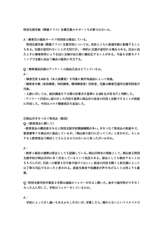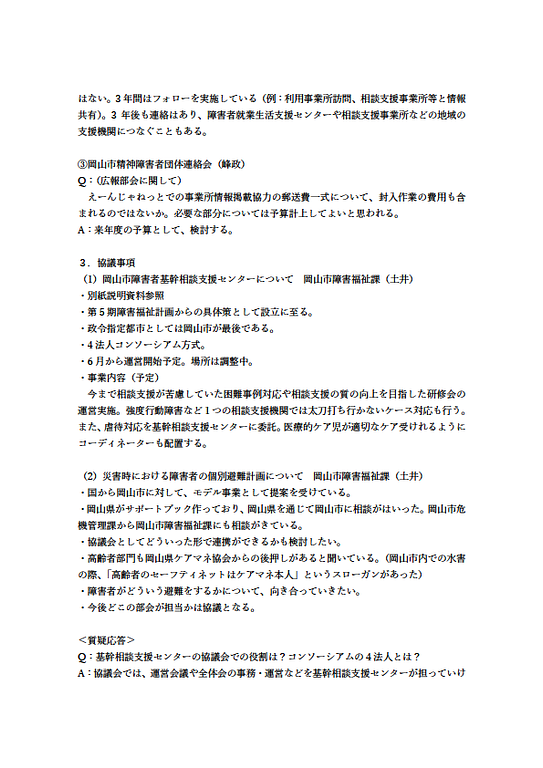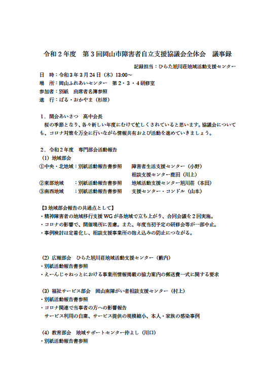 2021年4月21日運営会議/全体会令和2年度 岡山市障害者自立支援協議会全体会(第3回) 報告当協議会 令和2年度第3回全体会の議事録を掲載します。 別紙活動報告については、最終ページの該当部分をクリックください。 令和2年度 岡山市障害者自立支援協議会全体会(第3回) 報告.png 125KB 令和2年度 岡山市障害者自立支援協議会全体会(第3回) 報告.png 117KB 令和2年度 岡山市障害者自立支援協議会全体会(第3回) 報告.png 136KB 令和2年度 岡山市障害者自立支援協議会全体会(第3回) 報告.png 146KB 令和2年度 岡山市障害者自立支援協議会全体会(第3回) 報告.png 62.8KB ●議事録全体PDF ●全体会参加者PDF 【各種活動報告PDF】 ●中央・北地域部会 ●東部地域部会 ●南西地域部会 ●広報部会 ●福祉サービス部会 ●教育部会 ●就労支援部会 ●精神保健福祉部会 ●こども支援部会 ●障害福祉計画ワーキンググループ ●医療的ケア児支援ワーキンググループ