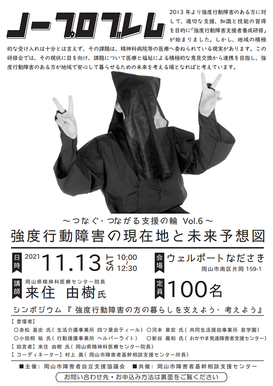 岡山市障害者自立支援協議会福祉サービス部会の(岡山市障害者基幹相談支援センター共催)研修会のご案内です。今回は、強度行動障害をテーマに、現状の確認・これまでの実践、今後の方策なども皆様と一緒に考えていけたらと思っております。是非、ご参加いただけますようよろしくお願いいたします。お申込みはコチラから。