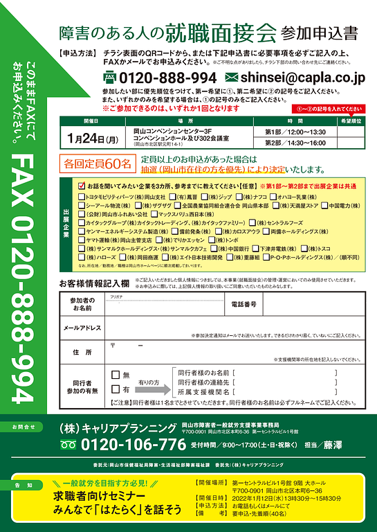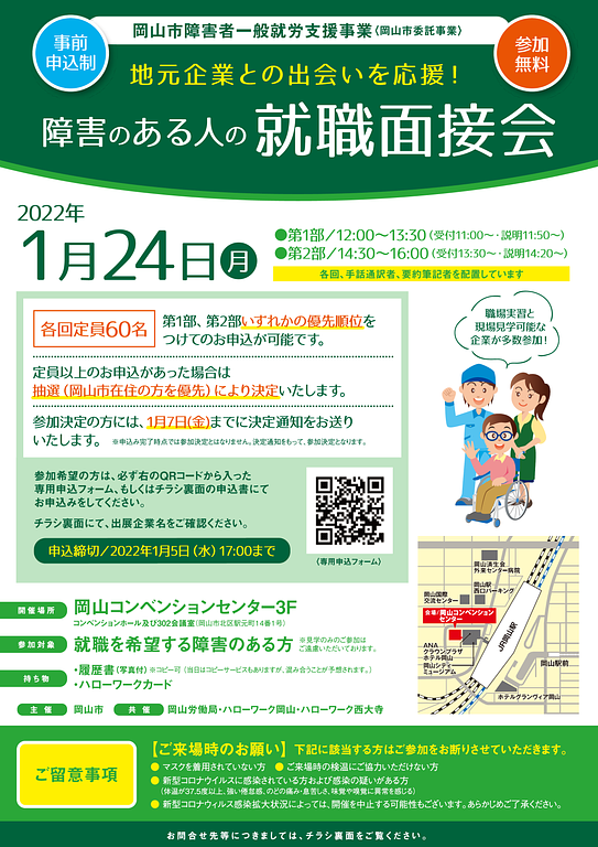 2021年12月6日地域情報障害のある人の就職面接会(岡山市主催)のご案内詳細は こちら からご確認ください。 障害のある人の就職面接会(岡山市主催)のご案内.png 1.01MB 障害のある人の就職面接会(岡山市主催)のご案内.png 940KB