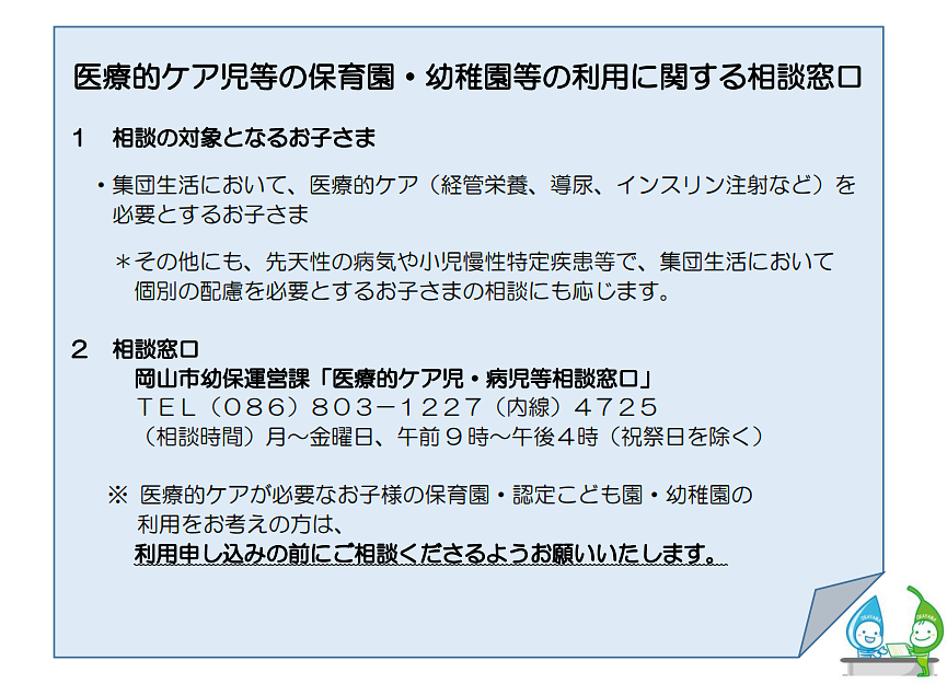 2022年8月7日地域情報医療的ケア児等の保育園・幼稚園の利用に関する相談窓口 医療的ケア児等の保育園・幼稚園の利用に関する相談窓口.png 185KB 医療的ケア児等の保育園・幼稚園の利用に関する相談窓口
