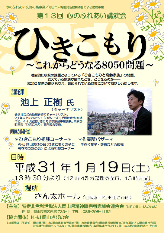 2019年1月14日イベント(一般向け)心のふれあい講演会「ひきこもり~これからどうなる8050問題~」 1月19日開催! 心のふれあい講演会「ひきこもり~これからどうなる8050問題~」 1月19日開催!.png 376KB
