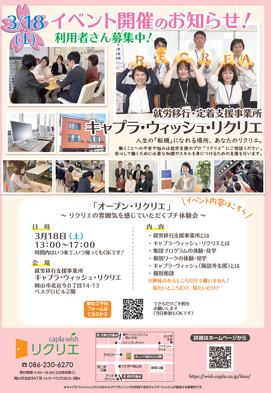 就労移行支援事業所、キャプラ・ウィッシュ・リクリエ主催でリクリエの雰囲気を感じてもらえるプチ体験会を開催します。