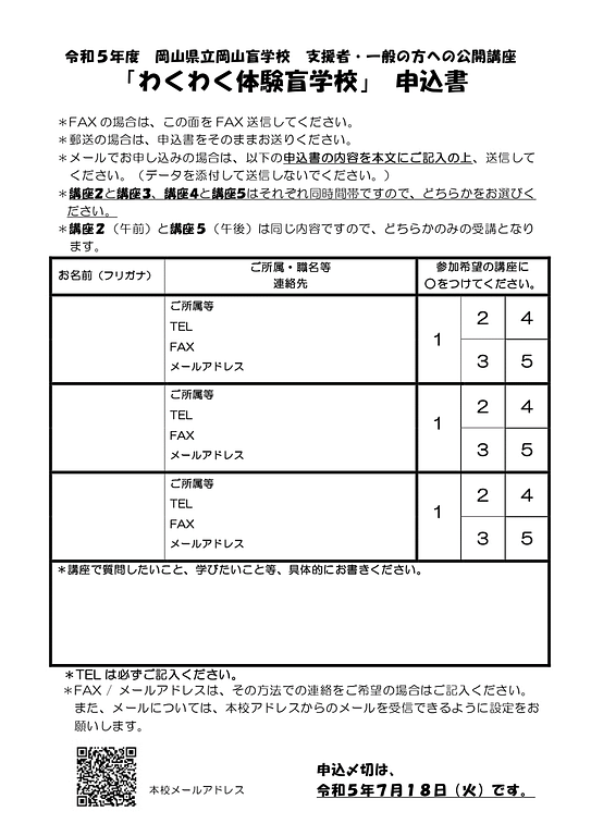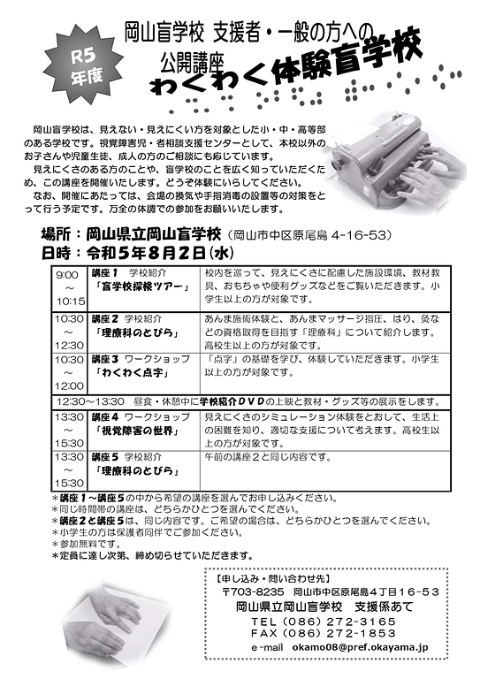 岡山盲学校は、見えない・見えにくい方を対象とした小・中・高等部のある学校です。視覚障害児・者相談支援センターとして、本校以外のお子さんや児童生徒、成人の方のご相談にも応じています。見えにくさのある方のことや、盲学校のことを広く知っていただくため、この講座を開催いたします。どうぞ体験にいらしてください。