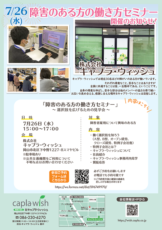 2023年6月8日イベント(一般向け)障害のある方の働き方セミナー開催のお知らせ7月26日(水)に障害のある方の働き方セミナーを開催します。 興味のある方は参加してみてください。 20230605-074858.png 757KB
