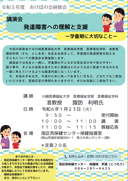 令和6年1月23日(火)あけぼの会主催の「発達障害への理解と支援」について講演会を開催します。