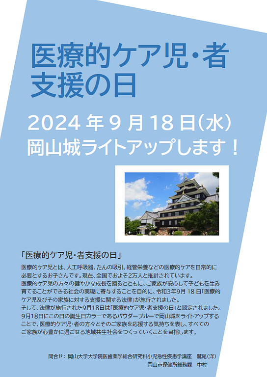 2024年8月28日地域情報「医療的ケア児・者支援の日(9月18日)」岡山城ライトアップ医療的ケア児・者の支援関連情報です 「医療的ケア児・者支援の日(9月18日)」岡山城ライトアップ.png 184KB