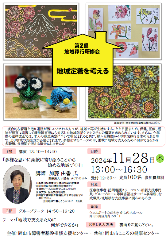 今回のテーマは「地域定着を考える」。講師に大阪で先駆的な実践をされている加藤由香先生(日本精神科看護協会精神科認定看護師)をお招きし、それぞれの立場で参加可能なグループワークを予定しています。