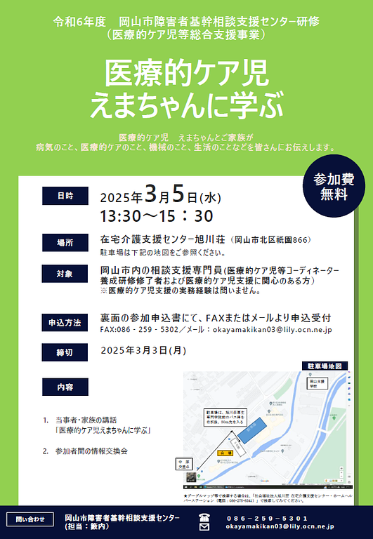 岡山市障害者基幹相談支援センター(医療的ケア児等総合支援事業)では、「医療的ケア児 えまちゃんに学ぶ」をテーマとした研修会を開催いたします。皆様のご参加を心よりお待ちしております。