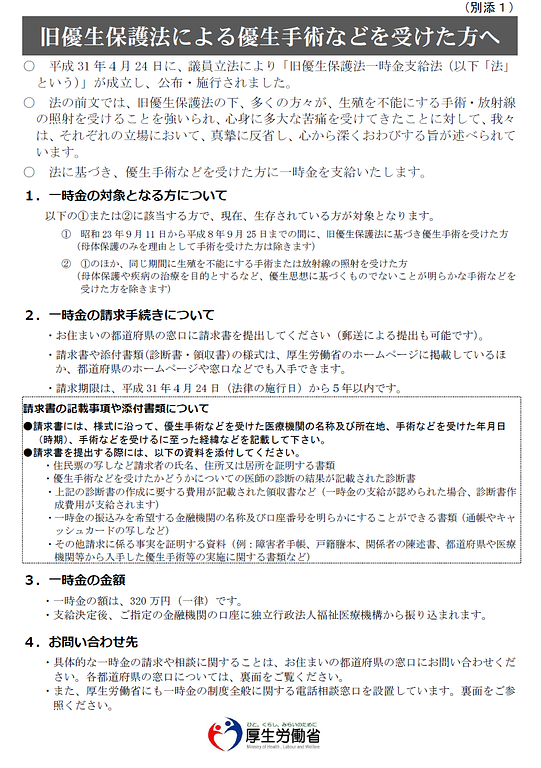 旧優生保護法に基づく優生手術等を受けた者に対する一時金の支給等について
