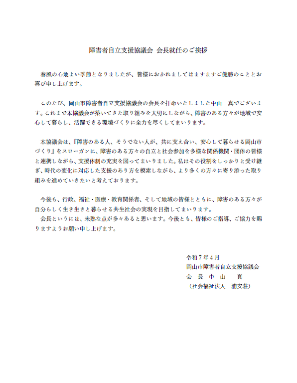 令和7年4月1日付けで、岡山市障害者自立支援協議会の会長および副会長が改選されました。