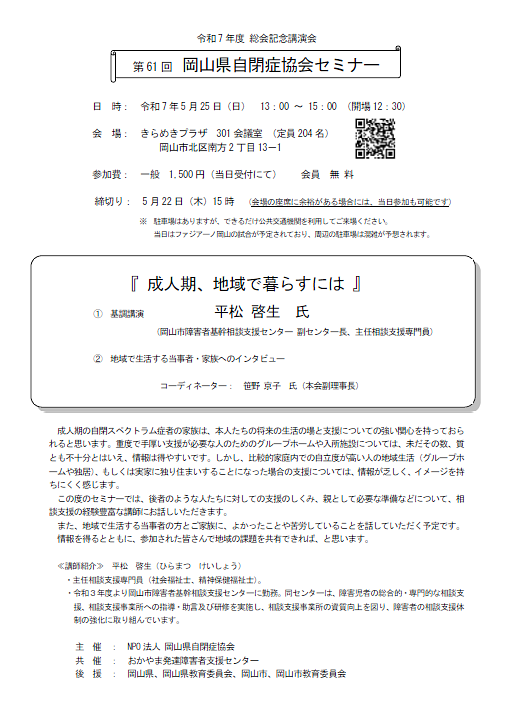【お知らせ】「成人期、地域で暮らすには」 (第61回岡山県自閉症協会セミナー )
