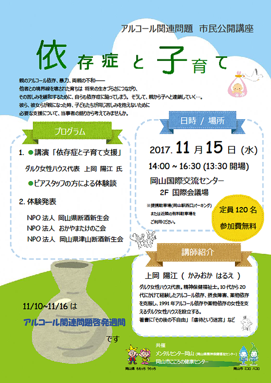 岡山県精神保健福祉センターでは今年度、アルコール関連問題啓発週間における取組みの一つとして市民公開講座を開催いたします。薬物・アルコール依存症者の回復支援施設 ダルク女性ハウスの代表である上岡 陽江(かみおか はるえ)さんを講師にお招きし、「依存症と子育て」というテーマのもと、ご講演いただく予定です。