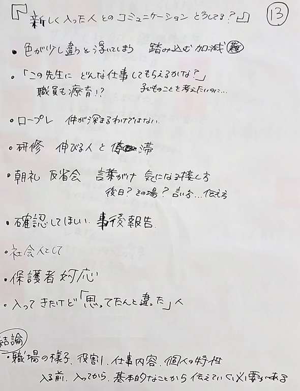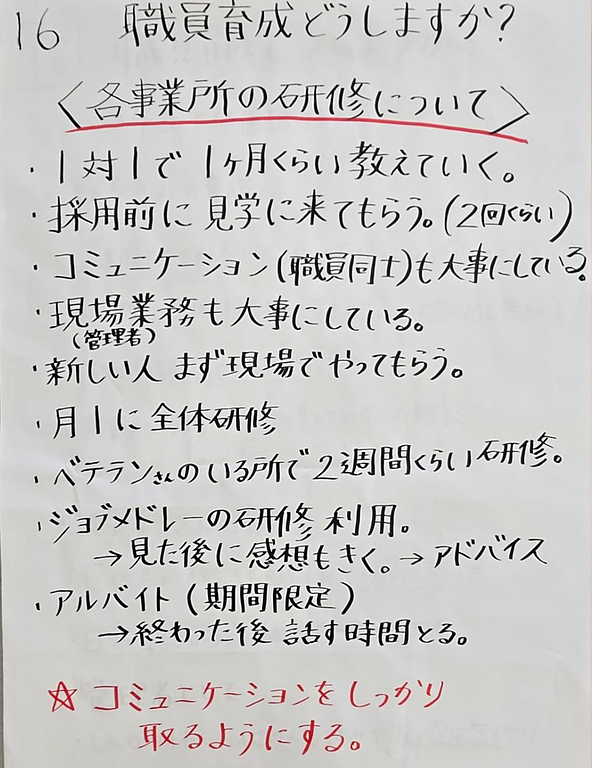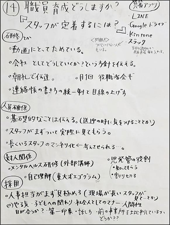 【まとめ】 •発表内容の冒頭で、日本で発表できる内容として新卒の研修内容が取り上げられた。 o定期的な研修で基礎や支援について学んでもらい、利用時の事例検討会やZoomでの参加機会、個別面談も実施する。 o新卒の場合、他の職員より多めの配慮が必要との意見があり、事業所の理念に納得しているかの確認が重要であるとの意見が出た。 o企業理念と個人のやりたいことが一致しない場合、上司や先輩の求めることとのギャップが生じ、それを埋めることが難しいという問題が指摘された。 •ベテラン職員への育成として、管理者が教育計画を作成し個別に声かけを実施している事例が紹介された。 o日常会話など自然なコミュニケーションを通じて、上司や普段接する機会が少ない人からも「自分のことを見てくれている」と感じさせる効果があるとの事例が挙げられた。 •管理者としての役割および休息の重要性についても意見が出た。 o管理者はしっかり休み、他のスタッフも休みやすい環境を作ることの重要性が強調された。 oまた、言語化力をつけるという意見もあり、最終的には施設全体の運営方法に直結する重要なポイントとして認識された。 •サブタイトル「スタッフが定着するには」と題して、採用後の研修や情報共有方法について議論が展開された。 o入社後の研修内容の記録を動画で残す、会社の理念や方針を伝えるなど、定着率向上のための工夫が共有された。 o日々の情報共有の手段として、月1回の会議、LINE、電話、Googleドライブ、キントーン、Slackなど多様なツールが利用されている。 o【問題点】ツールが多様すぎるため、対応が難しいスタッフがいるという課題も指摘された。 •長期在籍のスタッフと新規採用スタッフとの距離感や考え方の統一の難しさについても議論が盛り上がった。 o一定の考え方や支援の方法が共有されていないため、マンネリ化の解消をどのように図るかがテーマとなった。 •対人関係やメンタルヘルス研修として、東大試験のエゴグラムを用いた自己理解の取り組みが紹介された。 o管理者の役割や時間の使い方、また一般職スタッフがどの法令のもとに業務を行っているかの理解促進の重要性が議論された。 o「メンタルとして割り切ることも大事」との意見により、対人関係の調整や自己理解向上がスタッフ全体の健全な職場環境につながると認識された。 •採用に関しては、人事担当がスタッフを見極める取り組みや、やる気の評価等、具体的な評価項目についても触れられた。 •新しく入った職員と既存スタッフとの間で色の違いによる浮き上がりの問題が指摘された。 o【説明】新入職員がなじみにくく、既存の文化や価値観とのギャップが原因とされる。 •職員育成における研修の状況についての検討が行われた。 o療育を含む業務や保護者対応、新卒職員に対して社会人としての基本的な挨拶など、一からの指導が必要とされる。 o【課題】研修や反省会のタイミング、事後報告事項が多い現状が言及された。 •効果的なコミュニケーションとアドバイスのタイミングの難しさが議論された。 o【課題】朝礼など公の場での指摘と、個別のフィードバックのタイミングのバランスが問題視された。 •全体として、結論はまだ出ていないものの、改善の必要性が認識された。 •既存職員と新入職員の1対1の指導(約1ヶ月)による現場での直接的な学習が実施されている。 o【説明】採用前の現場見学も含め、実際の業務体験を通して業務内容の理解を深める。 •現場業務の重要性を強調し、管理業務や児童発達支援・デイサービスの業務に携わる職員への現場参加を促進。 •全事業所で月1回の全体研修や、ベテラン職員を対象とした約2週間の研修が行われている。 o各研修の内容は間違っていないと判断されるが、最も重要なのは職員間および利用者間のコミュニケーションであるとの結論に至った。 •職員育成において、具体的な教育プログラム、特に「エビデンスに基づいた支援」の導入が確立されておらず、経験者と新人スタッフ間の知識や「マインドセット」のギャップが大きい。発達障害に関する最新知識の統合も課題であり、職員間のスキルや理解度にばらつきが生じている。また、大規模な企業モデルが個々の施設に合わないため、効果的な職員育成システムの選択・適応に苦慮しており、共通の方向性や「仲介者」の役割が必要とされている。小規模施設では、時間やリソースの制約から基本的なビジネスマナー研修(電話応対、挨拶など)も困難な状況にある。 •職員研修のための十分な時間の確保が、送迎業務やシフト制といった業務上の制約により困難であり、研修計画が完全に実行されていない。さらに、全職員が同時に集まれない場合の効率的な情報共有や研修実施方法(資料配布、順次伝達など)が未だ検討中であり、確立されていない点が課題となっている。