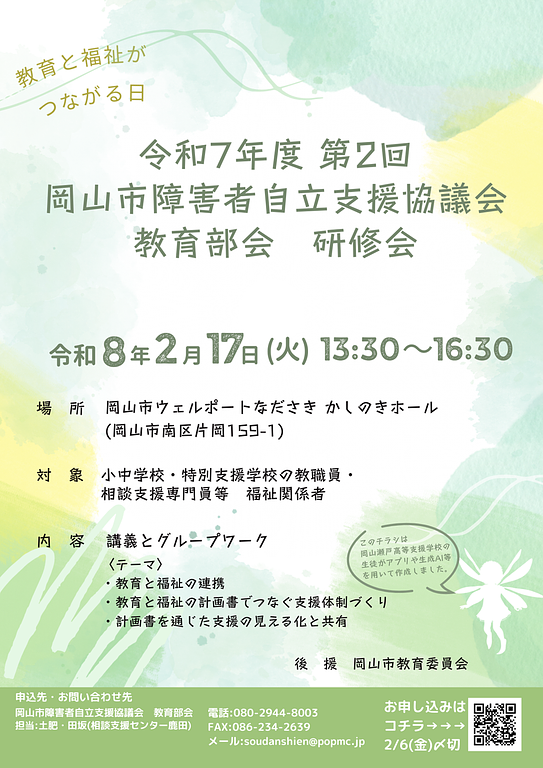 岡山市障害者自立支援協議会教育部会の取り組みとして、教育と福祉の連携強化のきっかけづくりとなるよう研修会が開催されます。