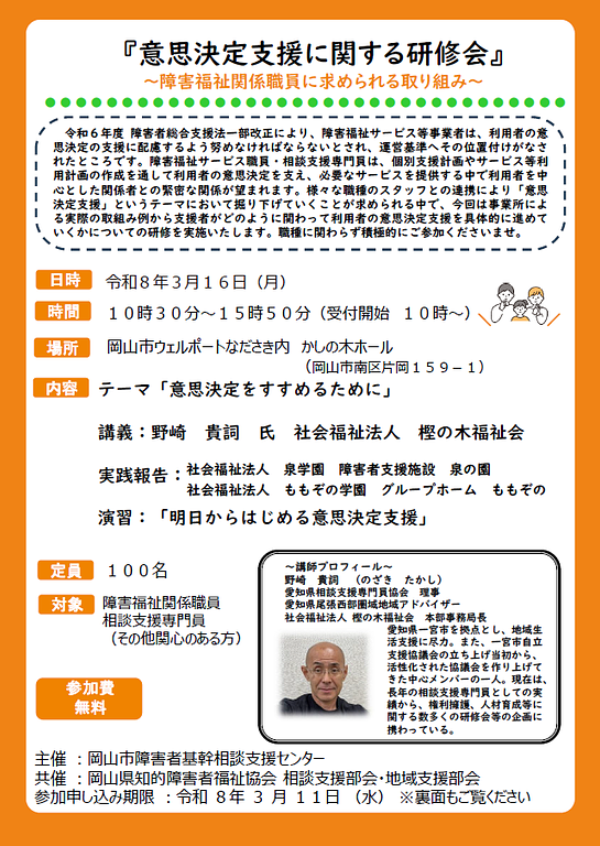 令和6年度の法改正により、障害福祉サービス事業所における「意思決定支援」が運営基準に位置付けられました 。 本研修では、利用者の想いをどう形にし、支援に繋げていくか。講義・実践報告・演習を通して、具体的に深掘りします 。現場で役立つ実践的な内容ですので、職種に関わらずぜひご参加ください 。
