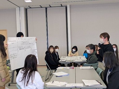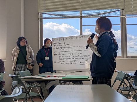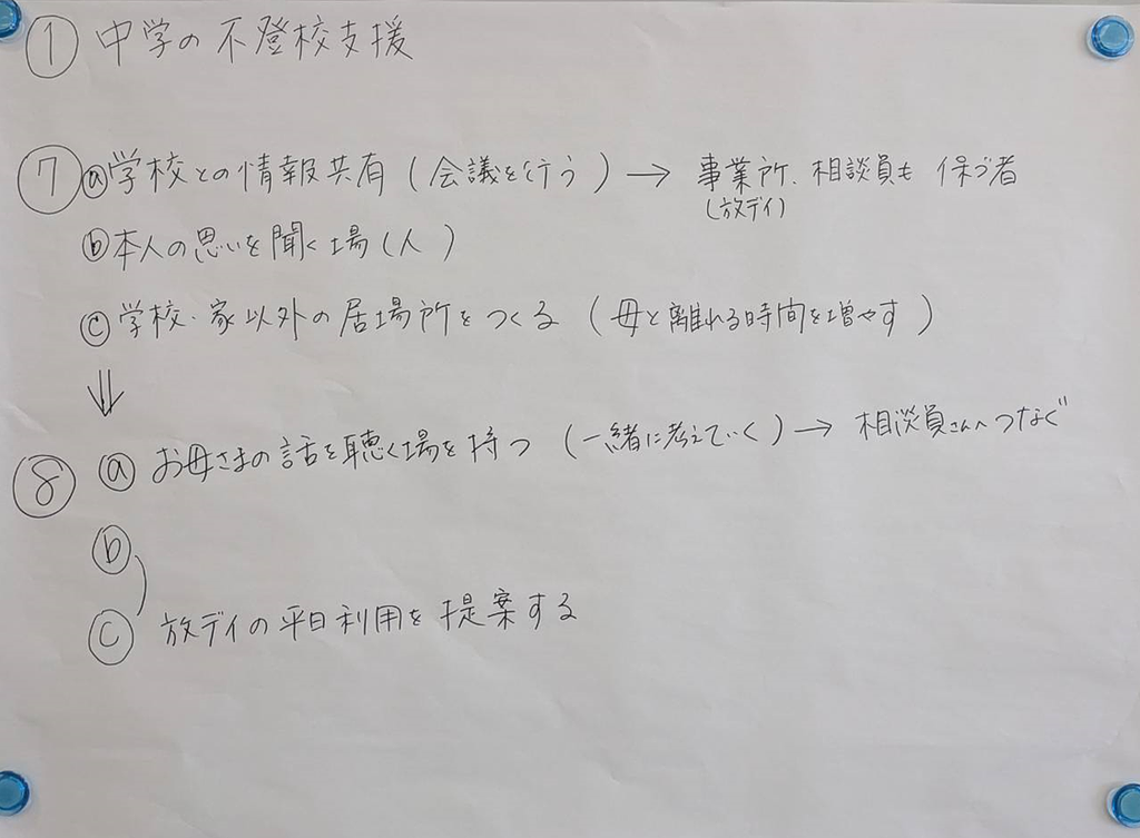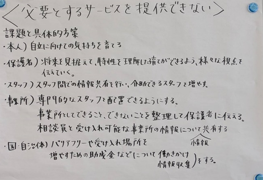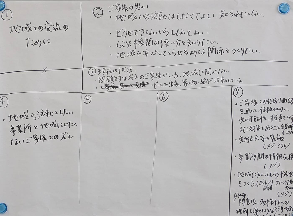 【グループワーク発表】 ① 地域との連携 【現状と方針】 保護者の中には、障害を地域に知られたくない、どうせ無理だと諦めるなど閉鎖的・消極的な考えがある一方、公共機関の使い方を知りたい、地域で暮らせる環境を作りたいという前向きな意向もある。 事業所は地域共生を目指し活動拡大を望むが、地域に出たくない保護者との間で意向のズレがある。 課題は、個別面談で信頼関係を築き、将来を見据えた支援の重要性を丁寧に説明すること、事業所向けに地域活動の意義に関する勉強会を実施すること、他事業所の取り組みを情報交換すること。 地域の障害理解を深めるため、事業所主催の祭り開催、地域清掃活動への参加、障害の有無に関わらず活動できるようなバリアフリー化への助成金を自治体に求める案が挙がった。