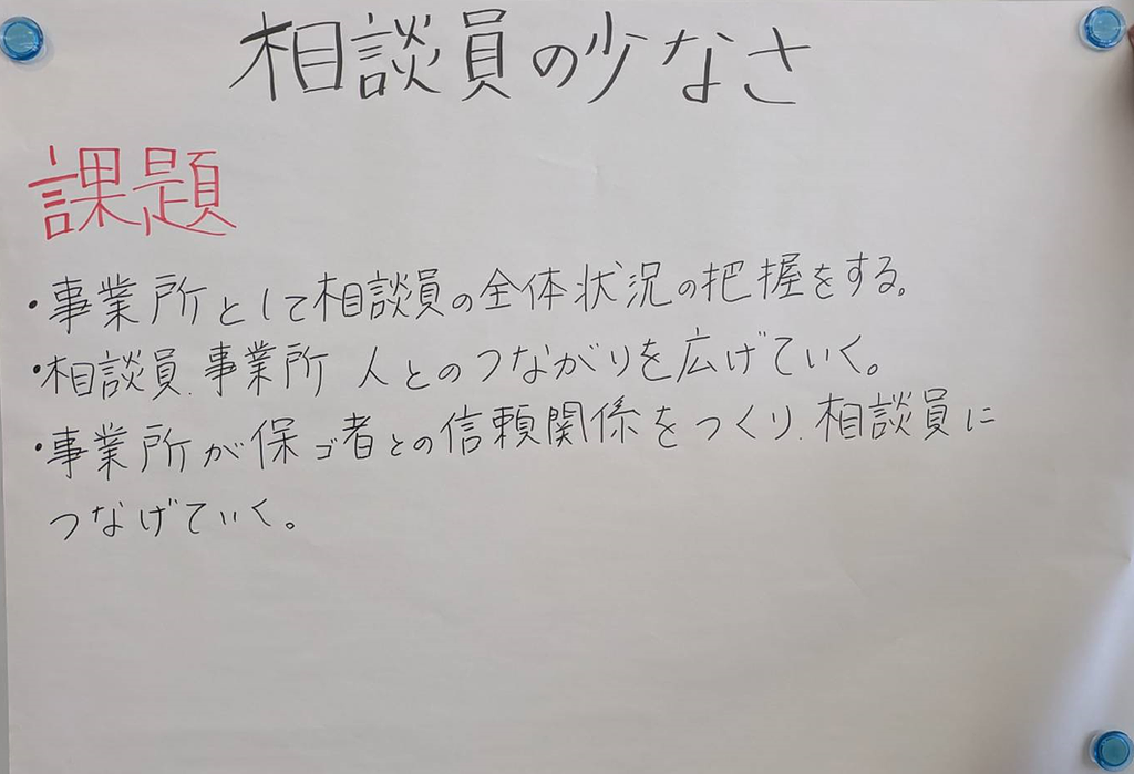 平松さんの座学 1. 個別課題から地域課題への視点の転換 - 個別課題から地域課題へのシフト - 一人ひとりの子どもを支援する中で見つかる「問題」が、他の多くの子どもにも共通する場合、それは地域全体の課題として捉えられる。 - 個別支援の視点を広げ、地域全体の構造的な欠陥(伸びしろ)として認識し、その差を埋める取り組みが地域課題へのアプローチとなる。 - 機会の平等と合理的配慮 - 障害の有無にかかわらず同じ機会が提供されているかを問い直す視点が重要である。 - 障害があることを理由に不利益が生じている状態は「差別」であり、それを解消するための「合理的配慮」が課題となる。 - 地域の構造的欠陥を「伸びしろ」と捉え、機会の平等を保障するための改善策を検討することが求められる。 2. 「問題」と「課題」の定義と違い - 「問題」の定義 - 本来あるべき姿(希望)と現在の状態の間に生じる「ギャップ」や「ズレ」を指す。 - 「何々ができていない」「何々がない」といったマイナス表現で示され、現状を分析することで「見える」ものである。 - 「課題」の定義 - 明らかになった「問題」を解決するために、具体的に取り組むべき事柄や行動(ミッション)を指す。 - 「何々をする」「何々ができるようになる」といったプラス表現で示され、これから「作り上げていく」ものである。 - 問題と課題を区別する重要性 - 両者を混同すると、問題点の指摘ばかりで個人を責めたり、根本的解決に至らず同じ状況を繰り返す弊害が生じる。 - 問題(ギャップ)を正確に特定し、それを解決するための具体的課題を設定することが、対立を避け、効果的な支援につながる。 3. 課題解決のためのアプローチと手法 - 弁証法(アウフヘーベン) - 対立する2つの意見がある際、どちらか一方に偏るのではなく、対話を通じて互いの主張の背景にある真意を理解し、より高次のレベルで解決策(ジンテーゼ)を見出す考え方。 - 3つのステップ: 1. 互いの言い分を認め、対立したままではいけないと認識する。 2. 対話を通じて、互いが大事にしている価値観をすり合わせる。 3. 両者の意見を活かし、より良い状態を目指す次のステージ(アウフヘーベン)へ昇華させる。 - ワークシートを用いた課題分析 - 個別事例(Gくんの事例)を基に、課題解決のプロセスを体系的に整理するためのツール。 - ステップ: 1. ①~⑤(個別課題の分析): 事例のタイトル、あるべき姿、現状を記述し、そのギャップ(問題点)と原因を分析する。 2. ⑥(不利益の分析): 問題が本人、スタッフ、事業所など関係者に与える不利益を多角的に洗い出し、地域への視点に広げる。 3. ⑦~⑧(課題設定): 分析を基に、個人レベル(ミクロ)、事業所レベル(メゾ)、地域レベル(マクロ)で取り組むべき具体的課題と方策を設定する。 4. グループワークの進め方 - テーマ設定 - 事前アンケートに基づき、昨年度から継続する課題を中心に5つのテーマを設定。 ① 地域との交流 ② 学校・園との連携 ③ 相談員の少なさ ④ 医療との連携 ⑤ 希望するサービスの少なさ - 進行と目標 - 参加者は希望するテーマのグループに分かれて話し合いを行う。 - 最終目標は、課題解決の具体的アクションプラン(誰が、何を、どのように行うか)をスケジュールシートに落とし込むこと。 - 成果物として、模造紙へ話し合い内容をまとめる。